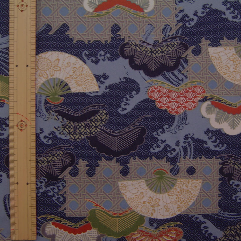 和柄【バーゲン50】 和調木綿 (波に扇と笠松文様)紺 10cm単位の切り売り